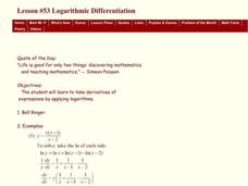 Young scholars analyze the steps required to take the derivative of an equation. In this calculus lesson, students take the derivative of logs using the same method for regular equations. They review derivatives of sine, cosine and...