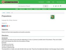 After reviewing the different purposes of prepostions and many examples, the class can practice using them in sentences. While little direction is provided in the plan, this is a fantastic resource for teachers looking for a simple...