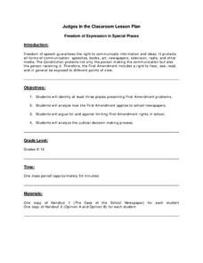 Young scholars identify at least three places presenting First Amendment problems. They analyze how the First Amendment applies to school newspapers. Students argue for and against limiting First Amendment rights in school. They...