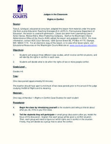 Learners study situations where rights are in conflict. In this conflict in rights instructional activity, students review a conflict situation and the Supreme Court ruling for the issue. Learners review the Bill of Rights and then...