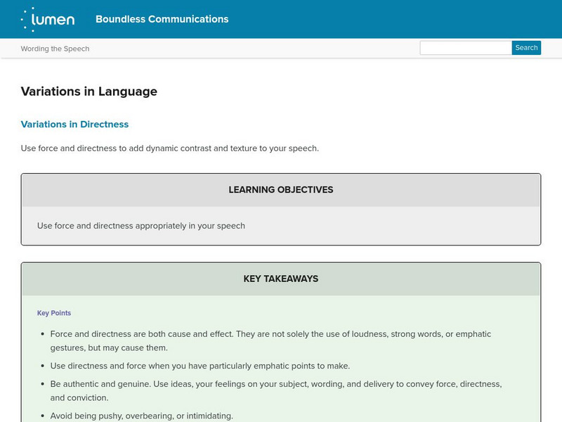 This lesson focuses on the use of variation in language when preparing a speech including directness, subjectivity and objectivity, abstraction, and accurate, reliable, unbiased, credible, and current sources.