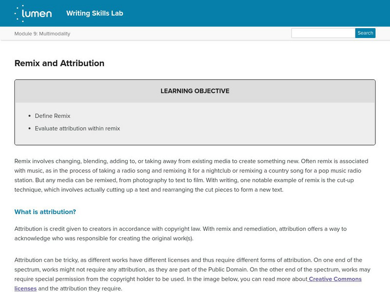 This lesson plan focuses on defining remix, why attribution is important in a remix, and how to attribute fairly. It also provides a table, Limitations When Remixing Copyrighted Work, and a practice exercise. CCSS.ELA-Literacy.CCRA.W.8
