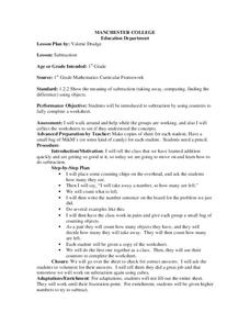 First graders practice subtraction with manipulatives. In this subtraction lesson, 1st graders use M&M's to count and then take away. They write number sentences to match their subtraction problems.