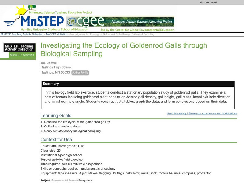 In this biology field lab exercise, students conduct a stationary population study of goldenrod galls. They examine a host of factors including goldenrod plant density, goldenrod gall density, gall height, gall mass, larval exit hole...