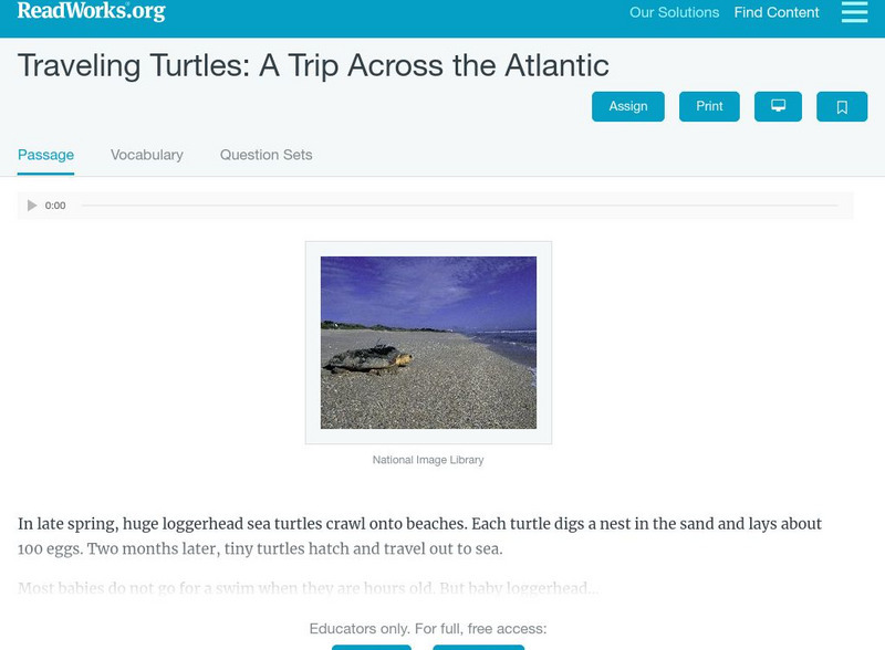 [Free Registration/Login Required] An informational text that asks the reader to make predictions about the lives of loggerhead sea turtles. A question sheet is available to help students build skills in reading comprehension.
