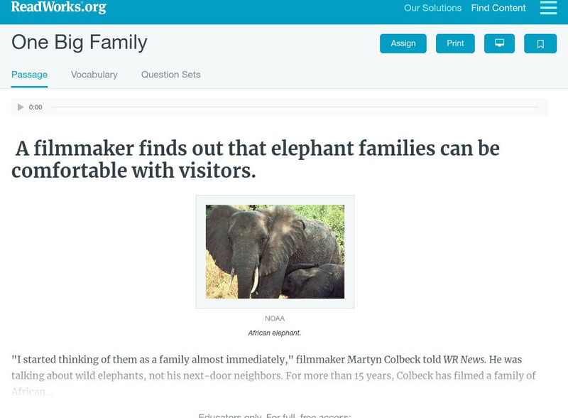 [Free Registration/Login Required] An informational text that asks the reader to make predictions about a filmmaker's experience working with wild elephants. A question sheet is available to help students build skills in reading...