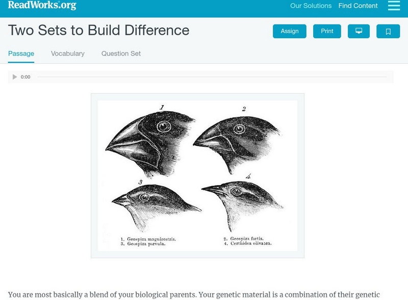 [Free Registration/Login Required] An informational text about Charles Darwin's research on trait variations in the Galapagos Islands. A question sheet is available to help students build skills in reading comprehension.
