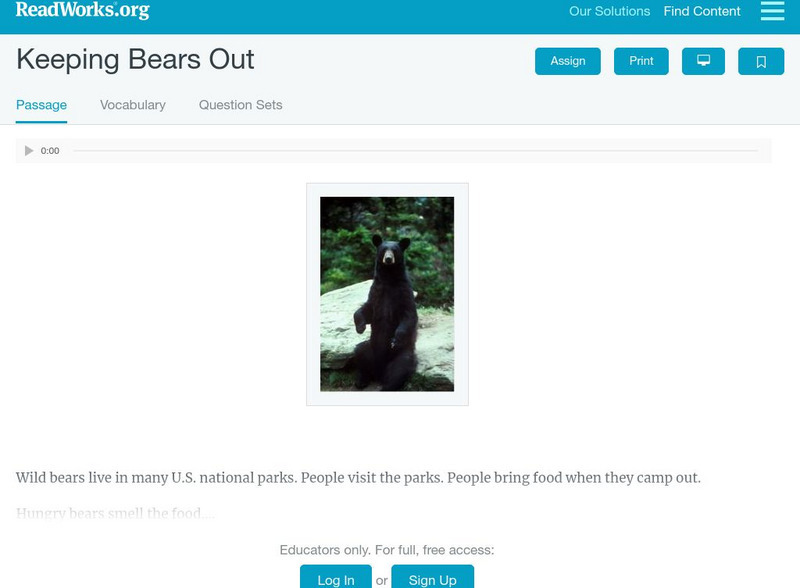 [Free Registration/Login Required] An informational text about why bears wander into camp sites and how to keep them out. A question sheet is available to help students build skills in reading comprehension.