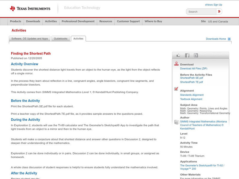 Students discover the shortest distance light travels from an object to the human eye, as the light from the object reflects off a single mirror. In the process they learn about reflection in a line, congruent angles, angle bisectors,...