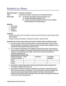 What's in a name? Pupils create a data set from the number of letters in the names of classmates. Each group then takes the data and creates a visual representation, such as a histogram, circle graph, stem-and-leaf plot, etc.