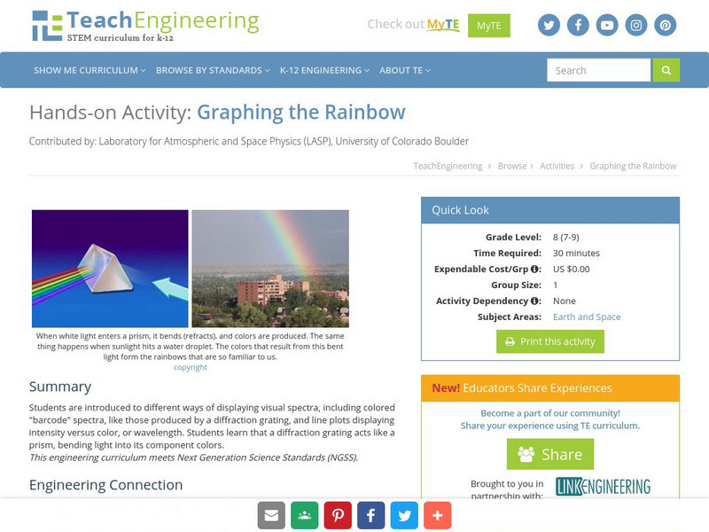 Students are introduced to different ways of displaying visual spectra, including colored "barcode" spectra, like those produced by a diffraction grating, and line plots displaying intensity versus color, or wavelength. Students learn...