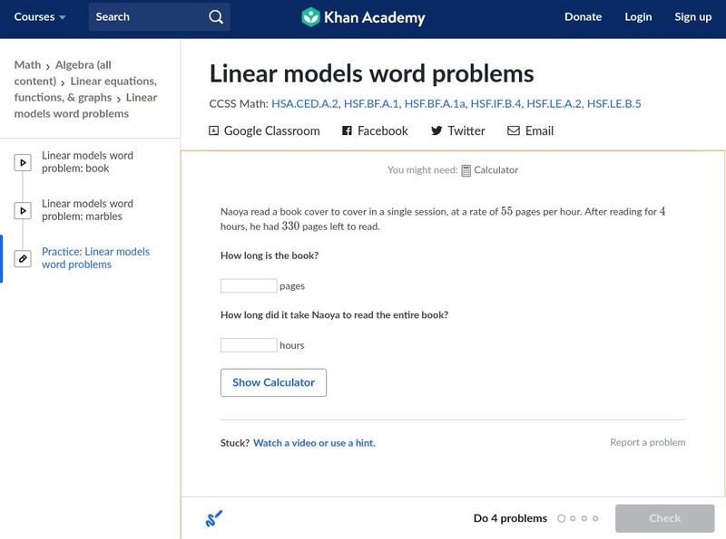 Solve general word problems about real-world relationships that can be modeled by linear equations or functions. Students receive immediate feedback and have the opportunity to try questions repeatedly, watch a video, or receive hints.
