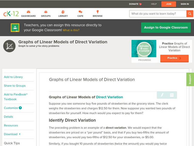[Free Registration/Login may be required to access all resource tools.] Students will write, graph, and solve direct variation models for real-world problems. Students examine guided notes, review guided practice, study vocabulary, watch...