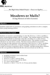 Students explore the use of matrices and graphing calculators to solve a complex linear programming problem. They test their solutions to determine the best division of land use for the city.