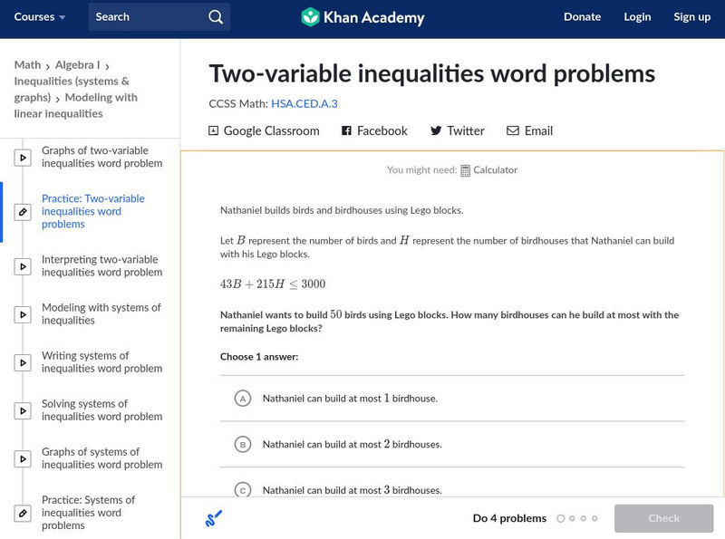 Solve word problems that involve linear inequalities in two variables. Students receive immediate feedback and have the opportunity to try questions repeatedly, watch a video or receive hints.