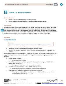 Use several skills to solve word problems leading to systems of equations. Scholars define variables and write equations to model situations described within word problems. Pupils solve the resulting system of linear equations using...