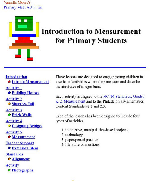 This site from the Math Forum is a great introduction to measurement for primary students. Each measurement activity has four components: interactive, manipulative-based project; technology; paper/pencil practice; literature connection.