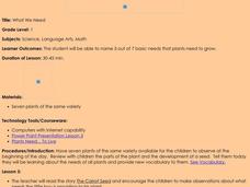 First graders identify basic needs of plants. In this plant growth lesson, 1st graders observe types of plants and review the parts of a plant as well as the development of a seed. Students review related vocabulary and read The...