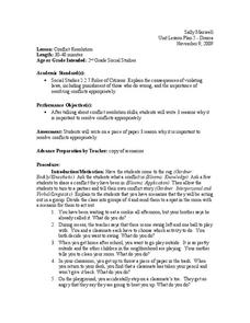 Second graders discuss conflict resolution. In this conflict resolution lesson, 2nd graders look at conflict scenarios and act them out in front of the class showing how they would handle the situation. They write on a piece of paper 3...