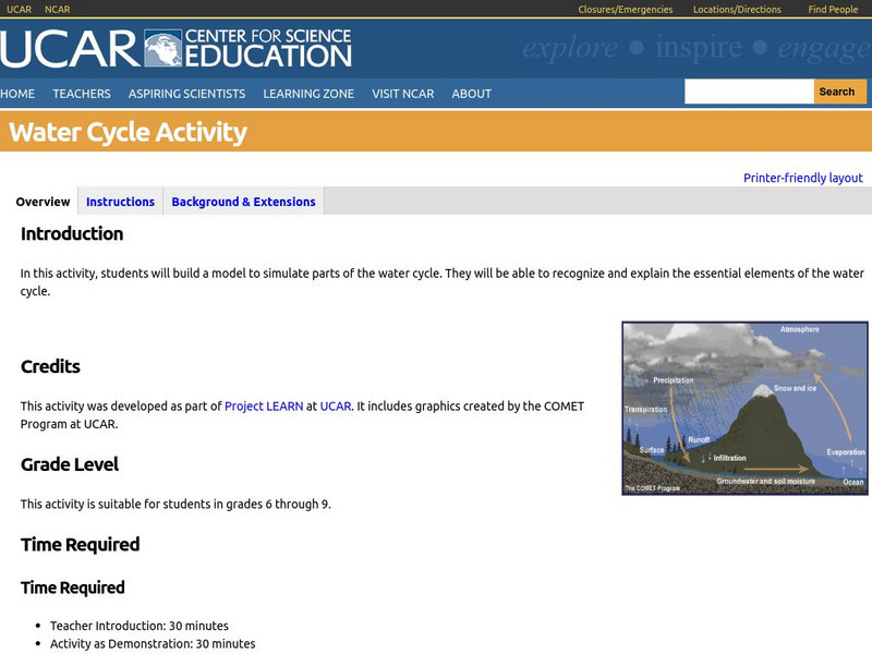This site provides a comprehensive introduction to the water cycle. Learners construct a model to simulate parts of the water cycle. Includes background information, links to standards, lesson plans, and assessment ideas.