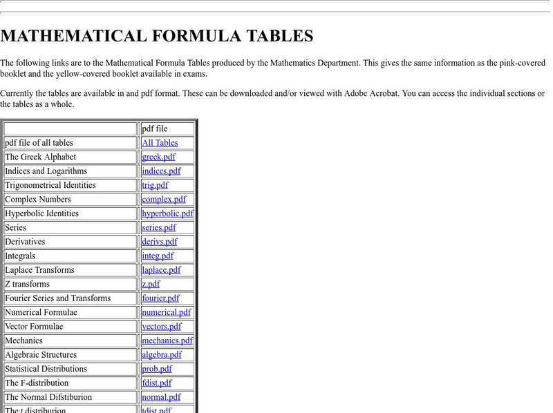 This site has links to tables of mathematical formulas. To view them, the student must download the formulas in pdf format.