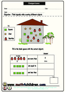 In this thinking logically while counting objects worksheet, students observe a building covered with squares, stars, and beetles and fill in the blank spaces of a graph by comparing the objects. Students solve three problems.