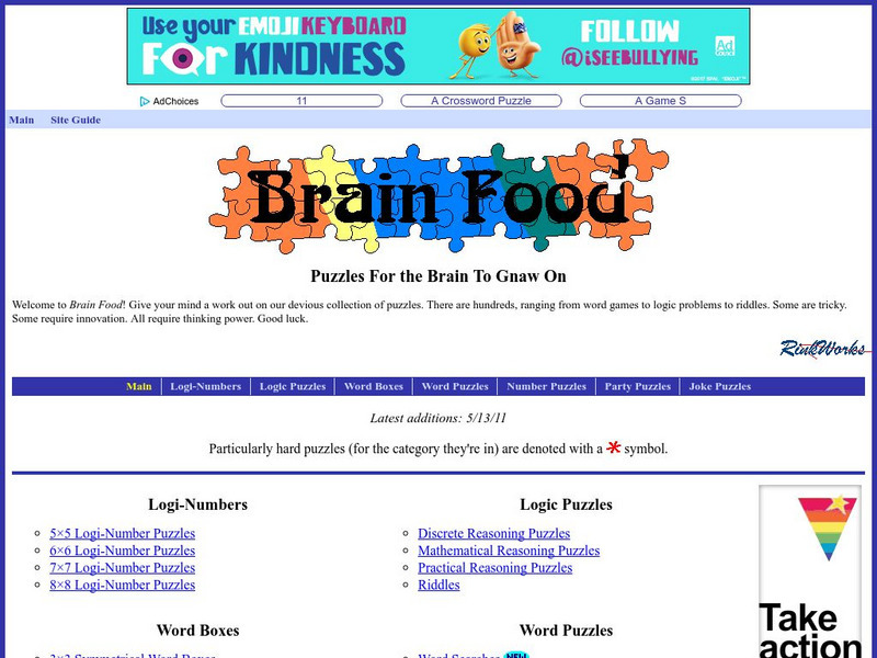 This site includes many games and puzzles ranging from word games to logic problems to riddles. These puzzles can be completed on line and offer interactive hints and solutions.