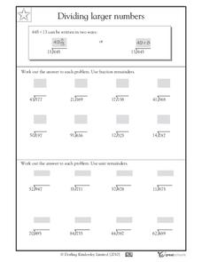 As math scholars begin taking on more complex division problems, it's time to cover the different ways to show remainders. Here, they complete eight long-division equations with a fraction remainder and then eight more with a unit...