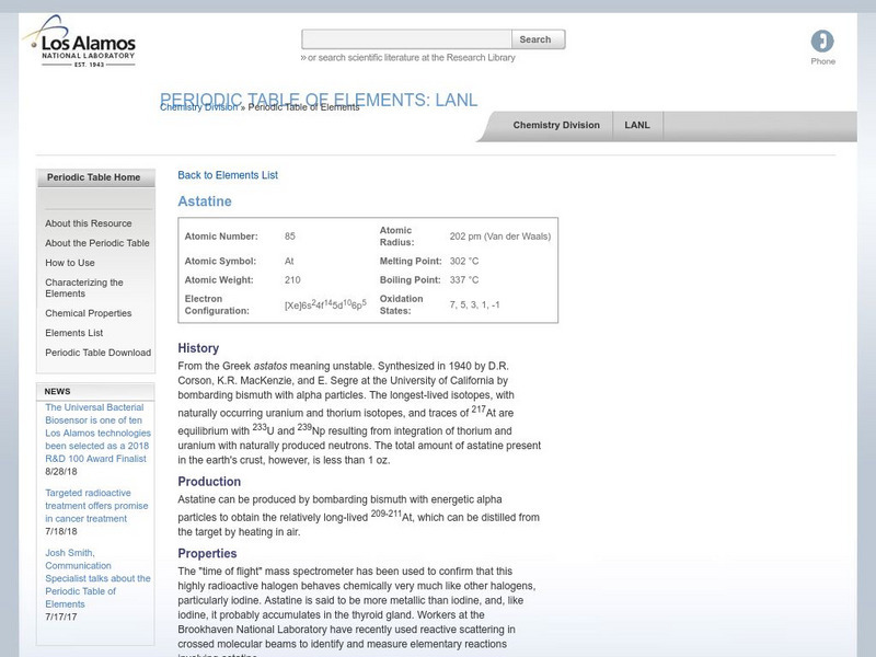 An up-to-date periodic table of elements. Click on each element to see properties, history, sources, and uses. Very comprehensive.