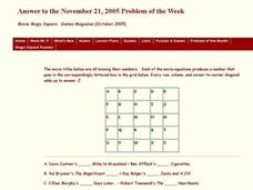 In this magic square worksheet, students solve equations to determine the numbers to be placed in grids.  This one-page worksheet contains 25 problems.