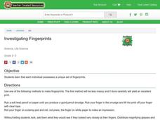 Students study the individuality of fingerprints. In this fingerprint lesson plan, students determine that each person has a unique set of fingerprints. They rub their fingertips with soft pencil lead and rub the print off on a piece of...