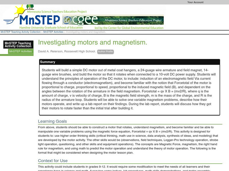 Students will build a simple DC motor out of metal coat hangers, a 24-guage wire armature and field magnet, 14-guage wire brushes, and build the motor so that it rotates when connected to a 10-volt DC power supply. Students will...