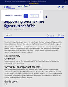 Students identify details that support the theme of a story. For this main idea or theme lesson, students view a video of "The Stonecutter's Wish." Students are given a graphic organizer to use as they discuss the main idea...
