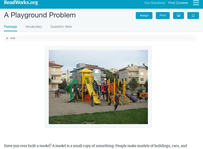[Free Registration/Login Required] Students read a nonfiction text about building a model for a new playground and answer questions about comprehension, supporting details, main ideas, vocabulary, and more. Links to a paired text and...