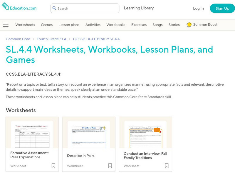 Education.com: Sl.4.4 Worksheets: Orally Report on a Topic or Text