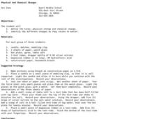 Students investigate chemical and physical changes. In this physical and chemical change lesson plan, students perform 3 experiments in the lab to observe changes in matter. They determine that no new substances are formed in physical...