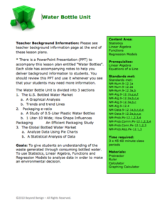 How much plastic do manufacturers use to create water bottles each year? The class explores the number of water bottles used throughout the years to determine how many consumers will use in the future. Class members compare different...