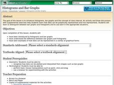 Students examine the use of bar graphs and histograms. In this data representation lesson plan, students investigate the proper use of bar graphs and histograms to represent data. They learn the proper geometric definitions, experience...