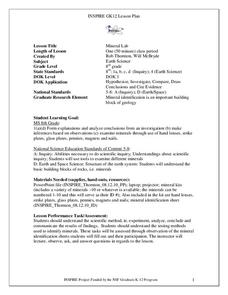Eighth graders examine the physical properties of different minerals. For this earth science lesson, 8th graders explain the uses of minerals in their daily lives. They complete the mineral identification table during the lesson.