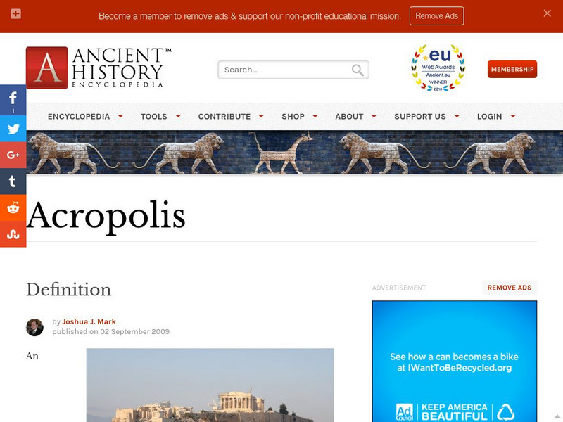 Encyclopedia entry provides and illustrated definition of Acropolis, with photos, maps and diagram of the Athens Acropolis built in the 5th Century BCE.