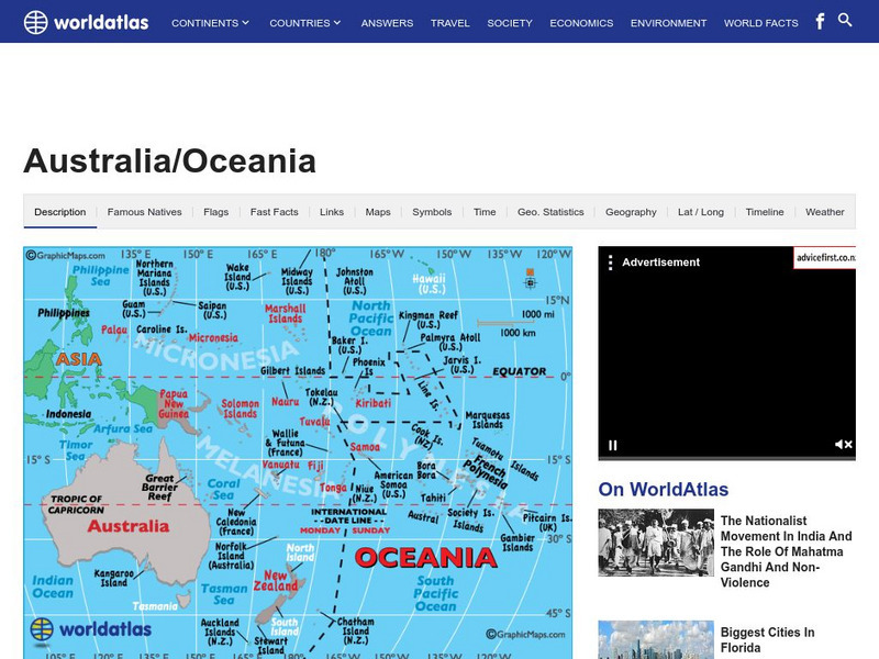 Features a description of Oceania that although the smallest continent includes Australia, New Zealand, Papua New Guinea, and Micronesia. Click on any tab about the map to learn much information about its geography, symbols, natives, and...