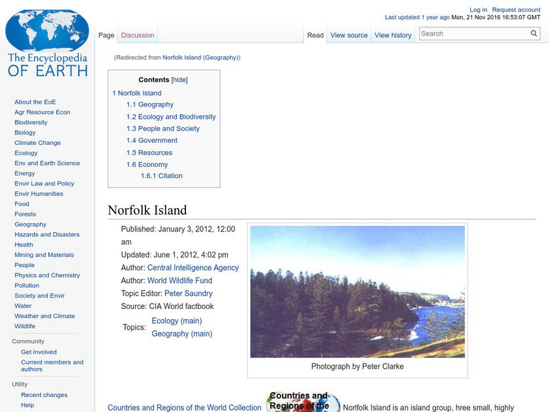 The Encyclopedia of Earth provides an overview of Norfolk Island (Australia), including its geography, natural resources, history, government, economy, and much more. Maps and images are also included, along with sources used to create...