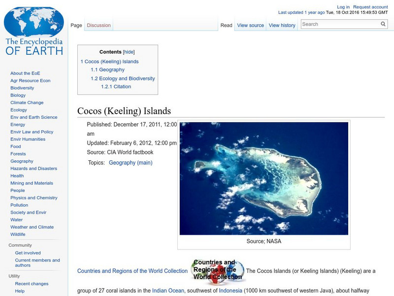 The Encyclopedia of Earth provides an overview of Cocos Islands (Australia), including its geography, natural resources, history, government, economy, and much more. Maps and images are also included, along with sources used to create...