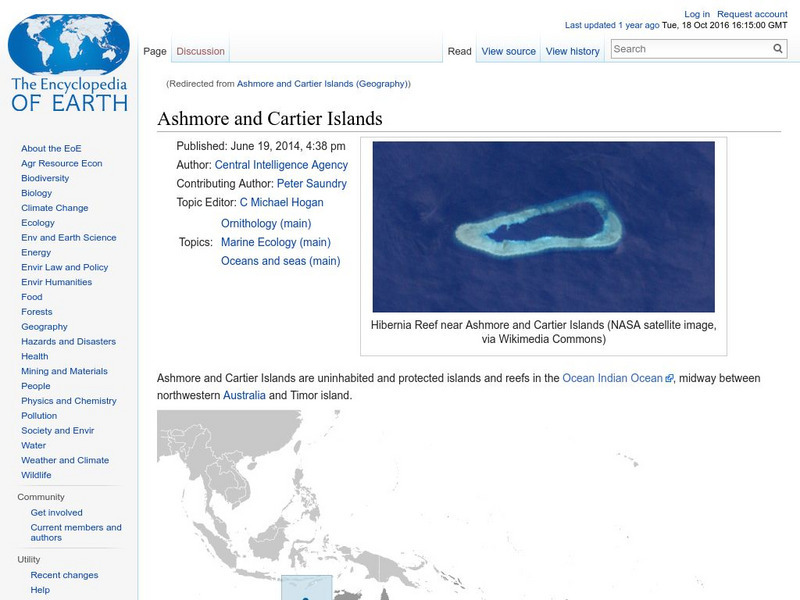The Encyclopedia of Earth provides an overview of Ashmore and Cartier Islands (Australia), including its geography, natural resources, history, government, economy, and much more. Maps and images are also included, along with sources...