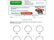 In this telling time learning exercise, students study 9 blank clocks with a digital time written below. Students draw the hands on the clocks to match the times that are to the nearest 5 minutes.