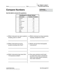 In this number comparisons worksheet, students use the table for the 'Enrollment in a Music School' to compare numbers and answer the six word problems.