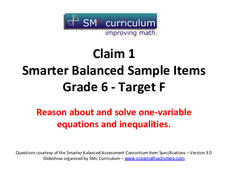 Put expressions, equations, and inequalities to work! Young scholars solve problems using various strategies. Meant as a snapshot of the Smarter Balanced Assessment, a set of seven questions includes topics from writing expressions to...
