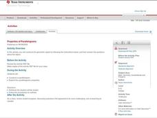 Scholars explore parallelograms in this geometry lesson. They investigate the properties of a parallelogram. Assisted by technology, your learners will construct a parallelogram and examine the sides, angles, and diagonals to discover...