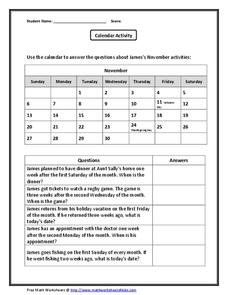 For this calendar activity worksheet, 4th graders use the calendar shown to answer 5 questions about when certain events happened. An answer key is provided.