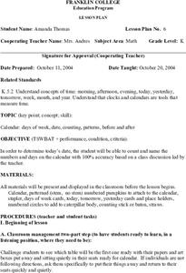 Students read a calendar. For this calendar lesson, students review calendar terms such as today, tomorrow, and yesterday. Students look at a calendar and determine the days date, the day of the week and the month.